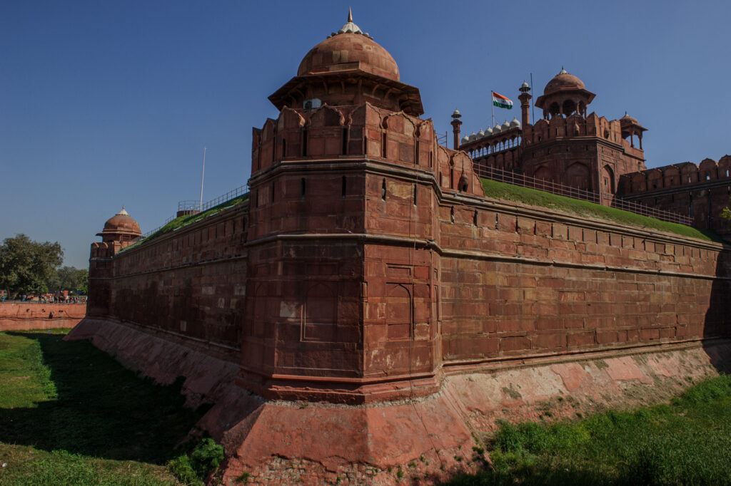 Le fort Rouge se tient sur le côté est de Shahjahanabad (ancien nom de Delhi). Le mur d'enceinte mesure près de 2,5 km de long et mesure entre 16 m de haut (du côté de la rivière) et 33 m de haut (du côté de la ville). Le bâtiment est immense (656 × 328 m).