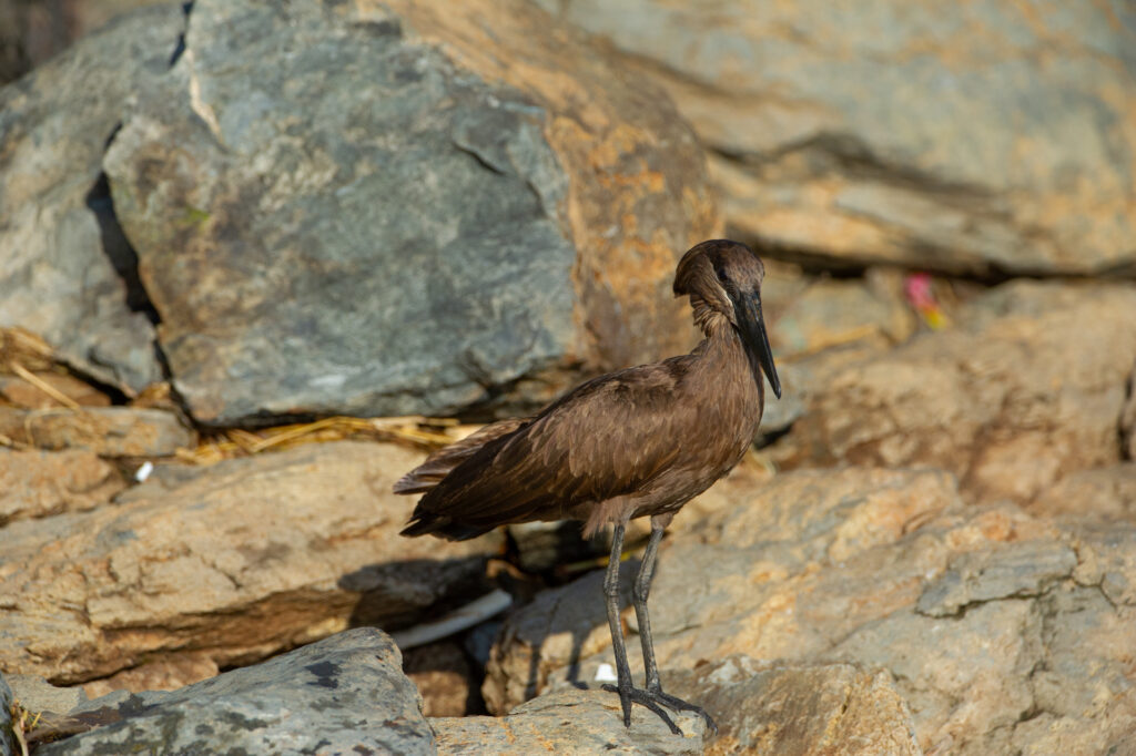L’Ombrette africaine est le seul membre de la famille des Scopidés et elle a deux sous-espèces. Cette espèce aquatique est très particulière avec son plumage entièrement brun, et son profil en forme de grand « marteau » ou « enclume » lui donne son nom anglais « hamerkop » ou « hammerhead ».